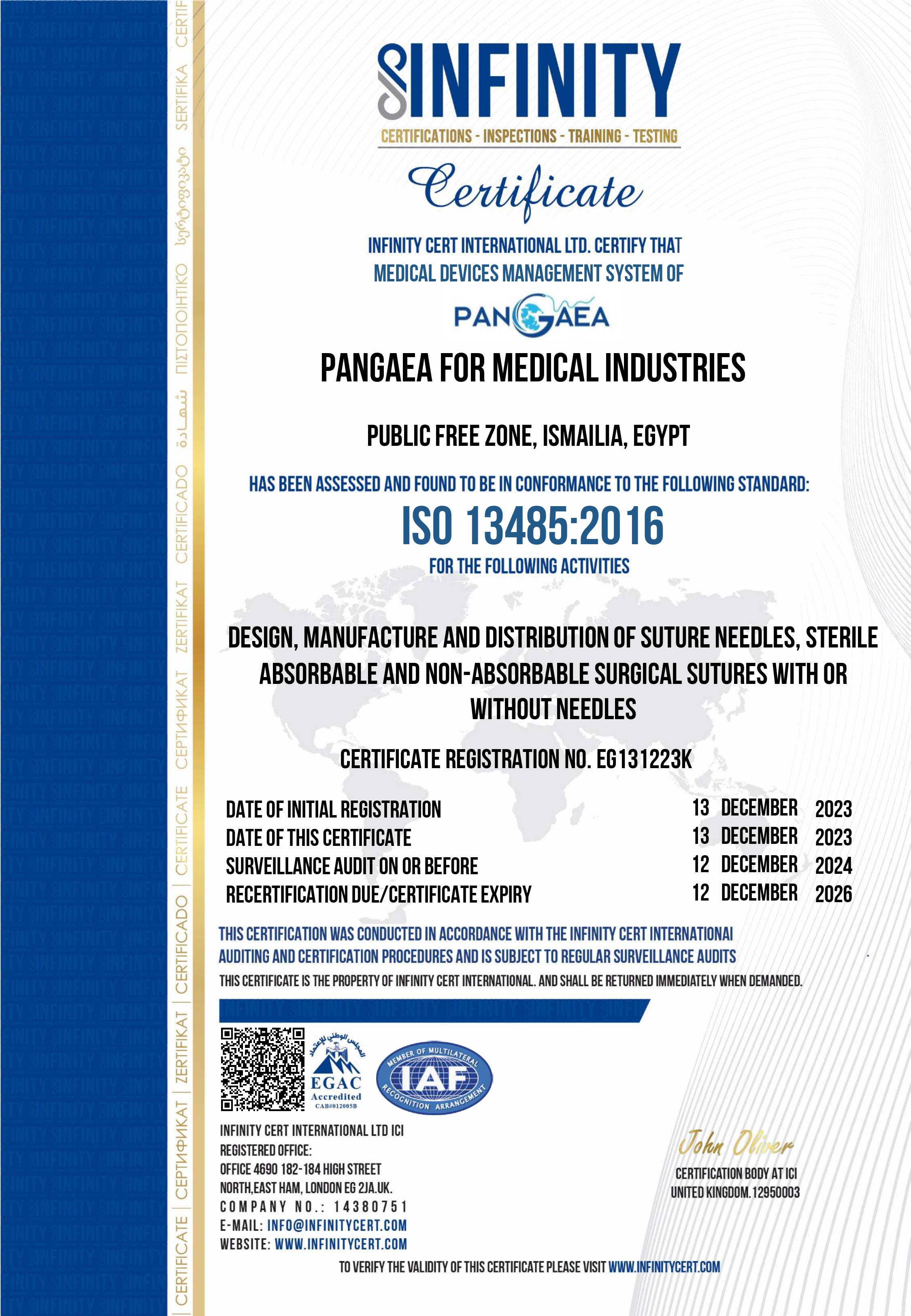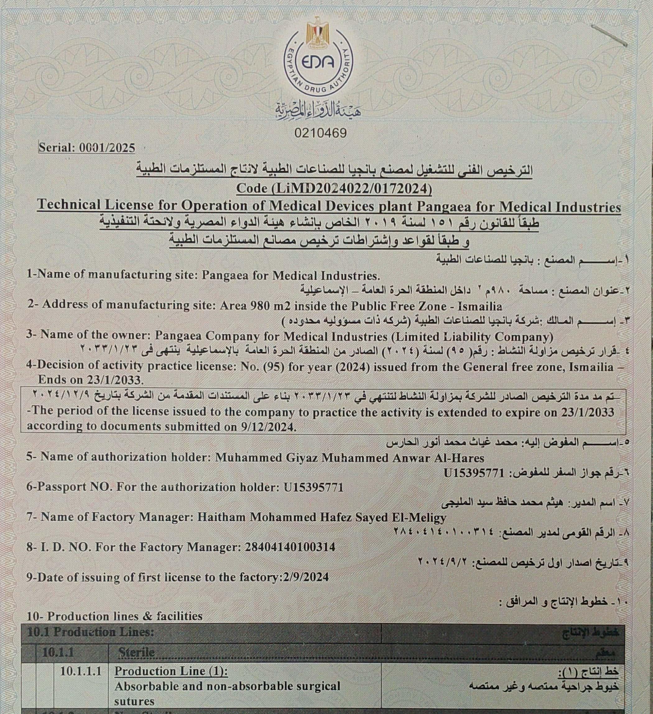 Pangea is officially licensed by the Egyptian Drug Authority (EDA) and holds the ISO 13485 - 2016 certification, an internationally recognized standard for quality management systems specific to medical devices. These certifications reflect our adherence to strict regulatory and quality standards.
